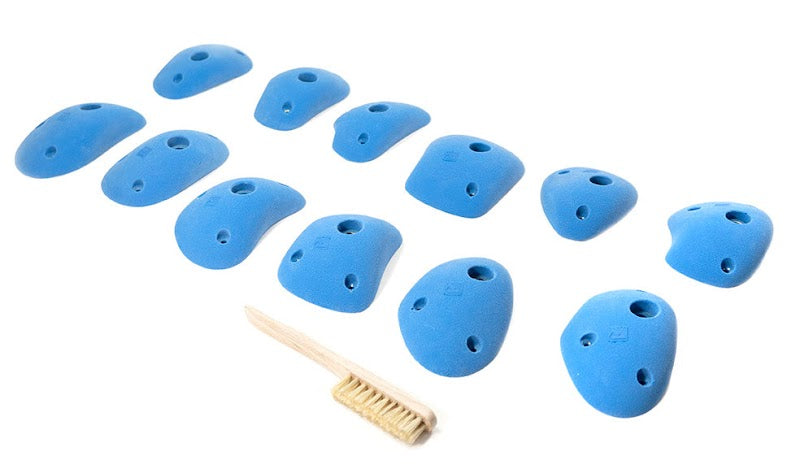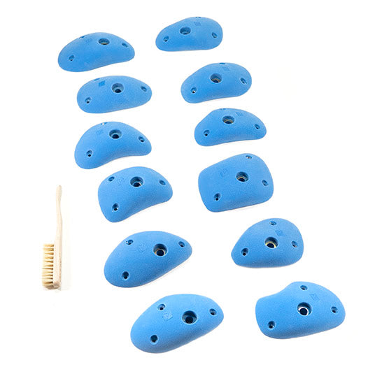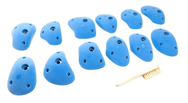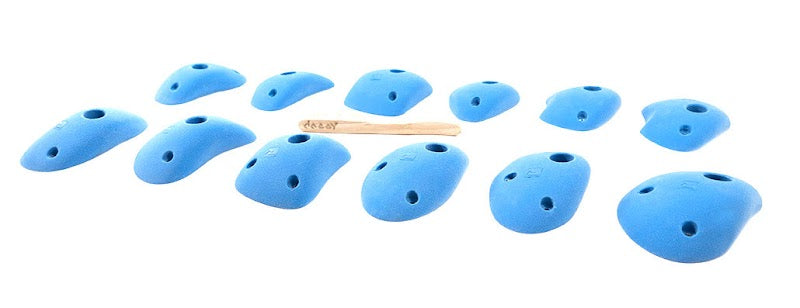 A set of 12 varied pinches with shallow sloping thumb catches. This set features a diverse range of grip positivity and a small footprint, making them a great choice for home walls up to 30 degrees and for use on small volumes at any angle. Slimp em or pinch em that's up to you!