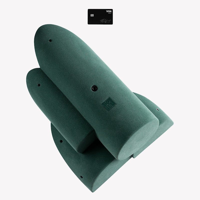 A mega angled, hollowback pipe climbing hold that narrows at one end and slopes towards the wall. Functions well as a pinch or edge. Shaped by Jason Kehl