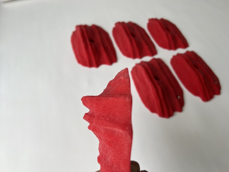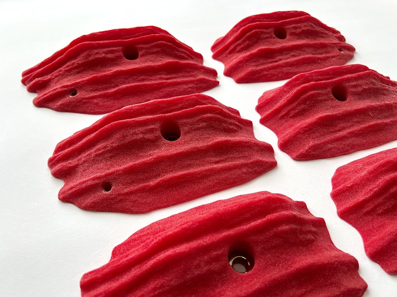 Six medium to large flat crimps from the red-river classic Stain, 5.12c. One crimp was mirrored and scaled up by around 10% and 20% to create this varied and balanced set.